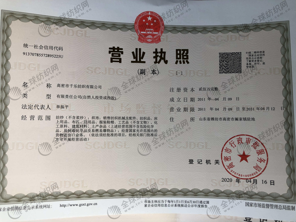 统一社会信用代码/营业执照注册号: | 91370785572895225U | 名称: | 高密市千乐纺织有限公司 |